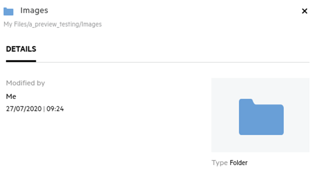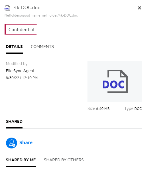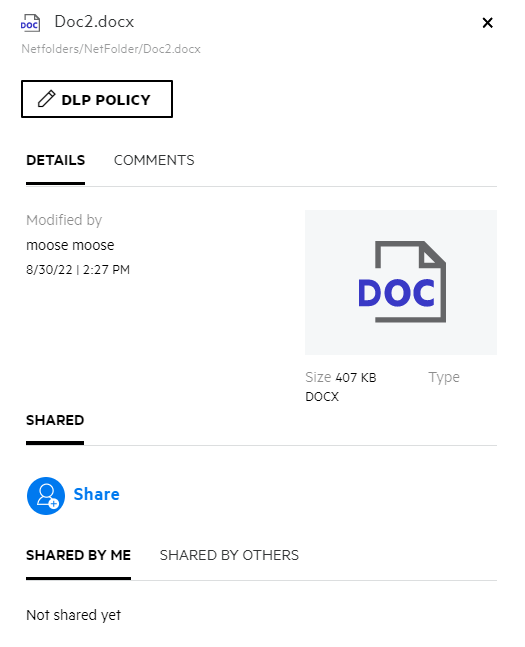 If the DLP is enabled and a policy is applied at the netfolder level, the DLP policy name will appear above the Details tab. The policy name is read-only and non editable.