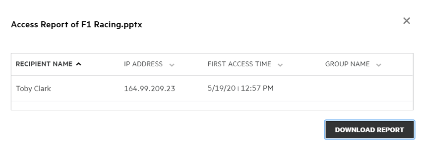 The report includes access information of the recipients like who accessed the file, the IP address of the machine with which file was accessed, date and time of the file access. You can download a pdf version of the report by clicking Download Report.