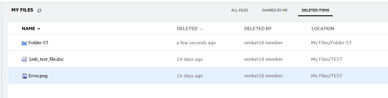 Lists the files or folders that are deleted by you. Filr enables you to retrieve the files and folders from trash and restore them to their previous location. When you restore a file, all associated comments are also restored.