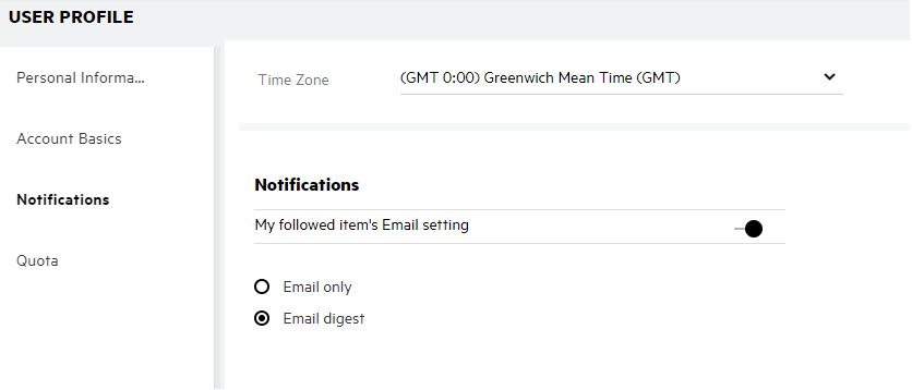 When a user is nearing to exceed or exceeds the data quota, a warning message displays on the user’s profile page informing the user that he or she is approaching the data quota limit. Also, an email notification is sent to the user when the data quota is exceeded.