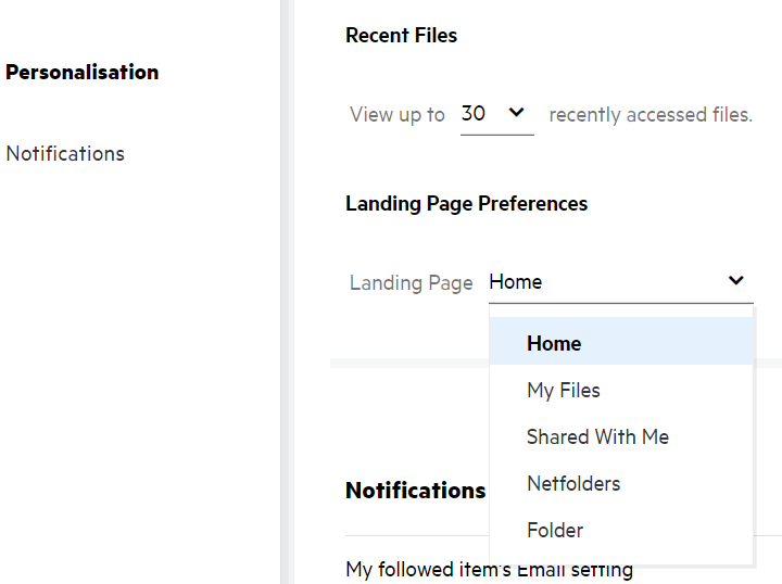 If the access to the folder set as a Landing Page Preference is expired or revoked by an Administrator, then the Landing Page Preference automatically resets to the Home page.