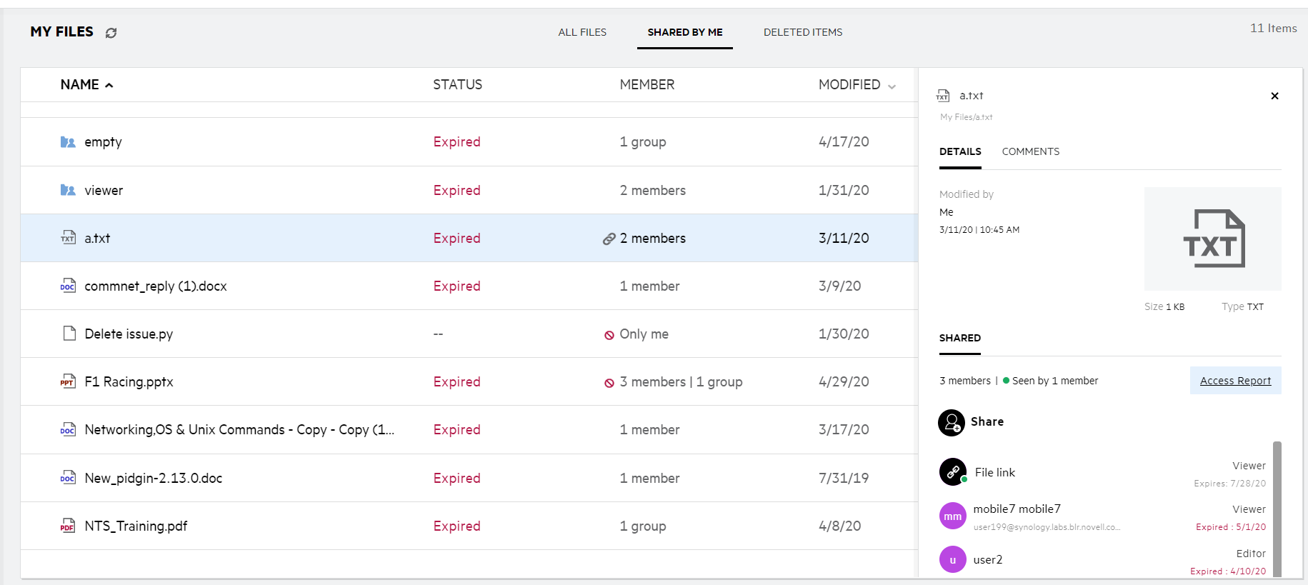 The details of the users and the groups are displayed along with the share expiry status.