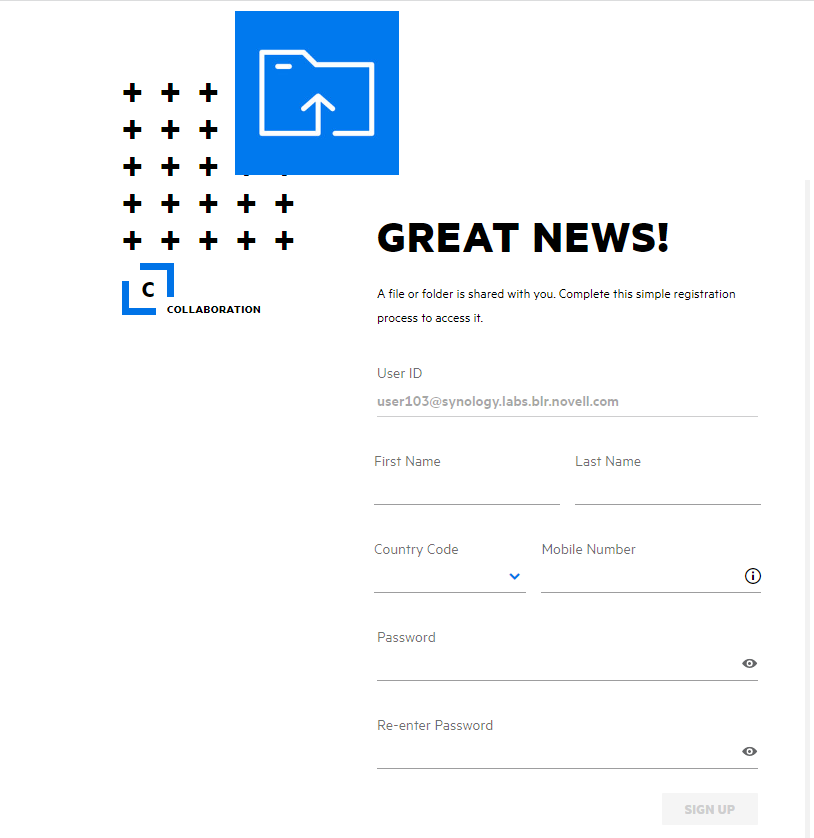 When a file is shared with an external user, the user has to log in to the Filr application to access the file. When the file is shared, an email is sent to the external user with the link to a self-registration form. The user has to register the details in the form and complete the self-registration process to be able to log in to the Filr application. The form looks as shown below: