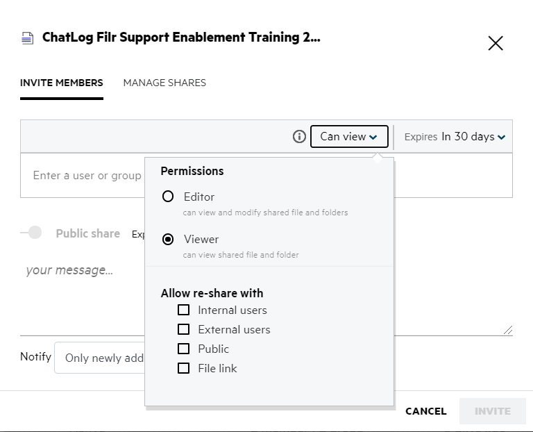 Here you can change the share permissions and the share expiry. Clicking the Reset option will reset the changes made to the old permission settings.