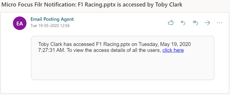 The Share Access Report provides you with the details of a file such as, who has accessed the file on what time and if the comments are added to the file. The Share access report is available only in Filr Advanced. When a receiver accesses the shared file, you will receive a notification email from Filr. You can also view the access report by clicking the link provided in the email, which then routes you to the receiver’s details. If the receiver has accessed the shared file, then Access Report is Available option is displayed in More Actions menu.