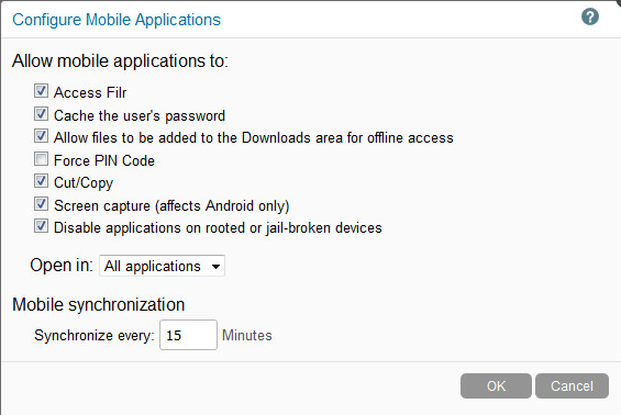 The Configure Mobile Applications dialog (below) (Administration Console > System > Mobile Applications) shows the default settings for the controls that administrators have over mobile application functionality and access to Filr.