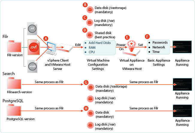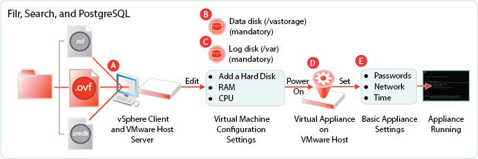 NOTE:The information in this section illustrates a VMware deployment. The same basic steps apply to other supported hypervisors. For specific deployment instructions, refer to the OpenText Filr 23.4: Installation, Deployment, and Upgrade Guide.