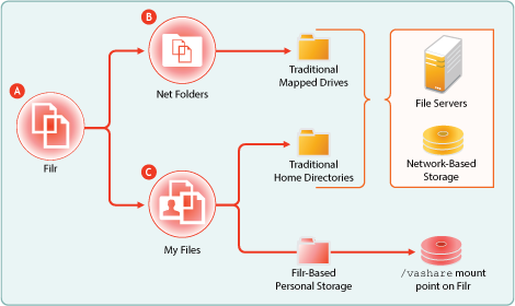 My Files can also point to file servers and/or network-based storage when these include traditional home directories. If the Personal Storage feature is enabled, My Files also provides access to personal files and folders that are stored in Filr itself. |