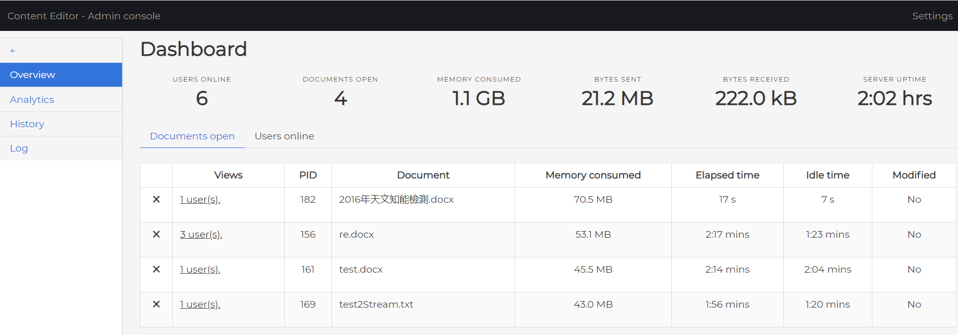You can view the list of live documents opened, total users, memory consumption, document URLs with the number of users viewing that document. You can also end the sessions directly from the panel which results in closing the socket connection to the respective document.