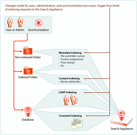 As illustrated in Figure 7-1, indexing occurs each time that Filr detects a data change. Index triggers include the following: