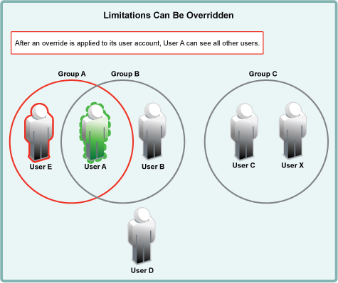 Applying new user-visibility limitations doesn’t affect overrides. User B is now restricted, but User A can still see all other users.