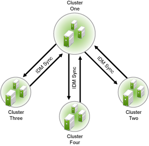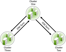 A preferred method is to make Cluster One an Identity Manager synchronization master. Cluster One synchronizes with Cluster Two and Three. Cluster Two and Cluster Three both synchronize with Cluster One. This is illustrated in Figure 6-2 below.