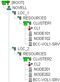 The Cluster Resource object is always placed in the Cluster object of the assigned peer clusters where the resource did not exist initially. Any OU can be defined as the BCC landing zone. The NCP Server object for the virtual Server, Cluster Pool, and Cluster Volume objects are stored in the landing zone.