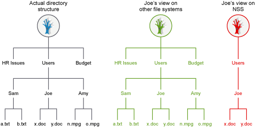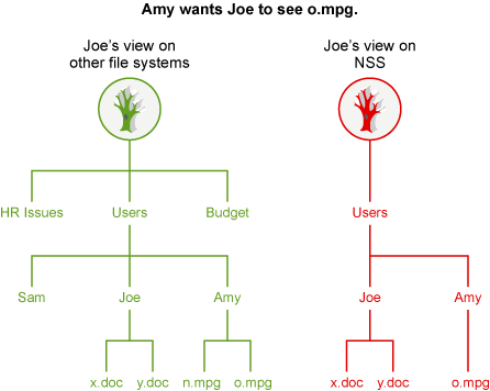 For example, Figure 12-2 shows how the user Joe has restricted visibility into the file system to view only those paths needed to access the files in his home directory on an NSS volume on Linux. On Linux POSIX file systems without NCP Server, Joe is able to view the entire directory structure.