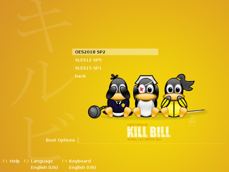 There are many ways how to organize the menu structure of a customized boot image. Here we illustrate one example that supports the installation of and the upgrade to OES2018 SP2, SLES12 SP5, and SLES15 SP1 of systems with traditional BIOS.