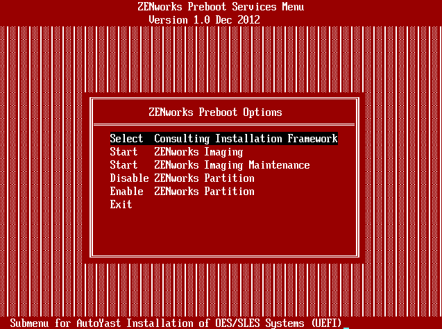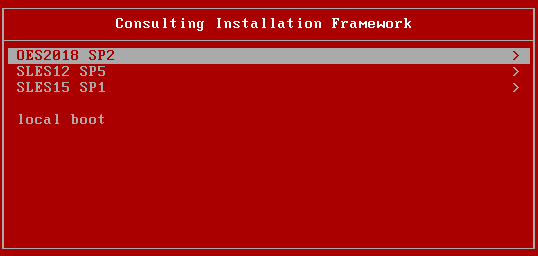 The first step in extending the Novell TFTP server configuration to support the installation of OES servers and SLES servers using the Consulting Installation Framework is to add a corresponding entry to the main menu, that is defined in /srv/tftp/pxemenu.txt.