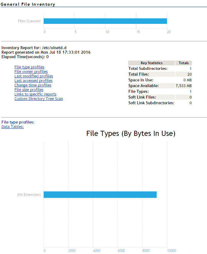 At this point, you can click any of the links to the left of the Key Statistics table to move quickly to the generated information, or you can create a custom report. See Generating a Custom Inventory Report from a File Inventory Report.