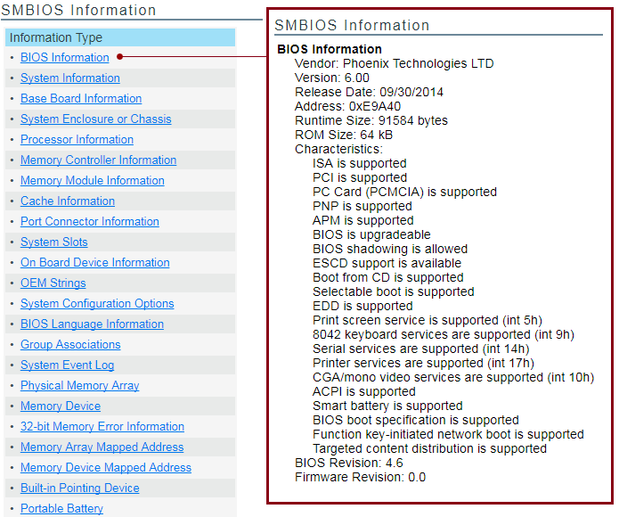 Figure 10-5 Example SMBIOS and BIOS Information Pages