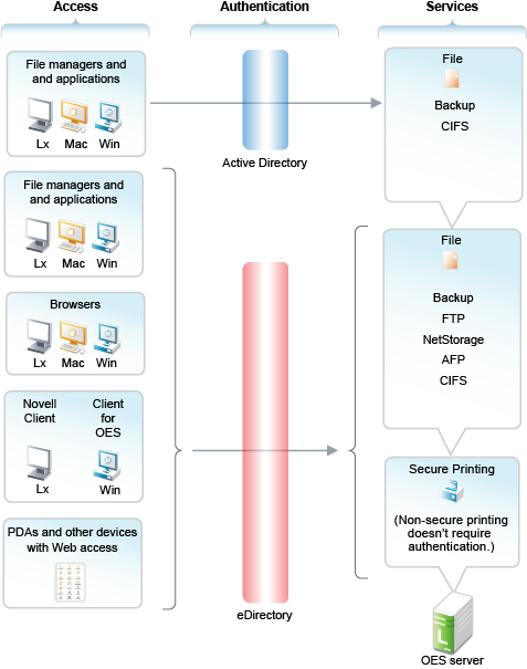 Figure 14-1 illustrates the access methods supported by OES services. eDirectory provides authentication to each service.