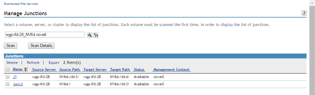 After iManager connects to the server, it searches all the volumes on that server for junctions and lists them.