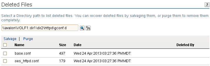 As an administrator, you can use the Files and Folders plug-in to iManager to salvage or purge deleted files from an NSS volume where the Salvage attribute is enabled. When salvaging deleted files, the file content, trustees, trustee rights, and inherited rights filter are just as they were before the file was deleted. If the rights in the tree above the salvaged file have changed, then the inherited rights for the salvaged deleted file is calculated based on the current rights above it in the directory tree.