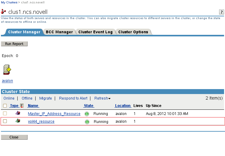 4. In the list of resources, locate the new resource, such as vol44_resource, and notice the state of the resource. It should be online and running.