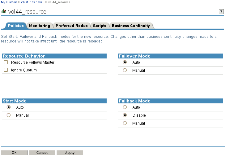 • Start Mode: If the Start mode is set to Auto, the resource automatically loads on a designated server when the cluster is first brought up. If the Start mode is set to Manual, you can manually start the resource on a specific server when you want, instead of having it automatically start when servers in the cluster are brought up.