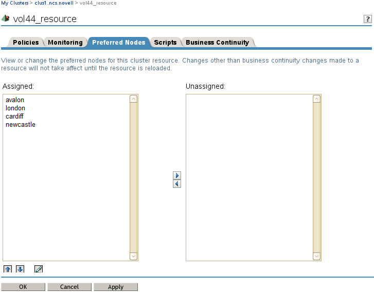 When you bring a resource online, it is automatically loaded on the most preferred node in the list. If the node is not available, the other nodes are tried in the order that they appear in the list. You can modify the order of the nodes by clicking the Edit (pen) icon to open the list in a text editor. In the editor, click OK to close the editor, then click Apply to save your changes.