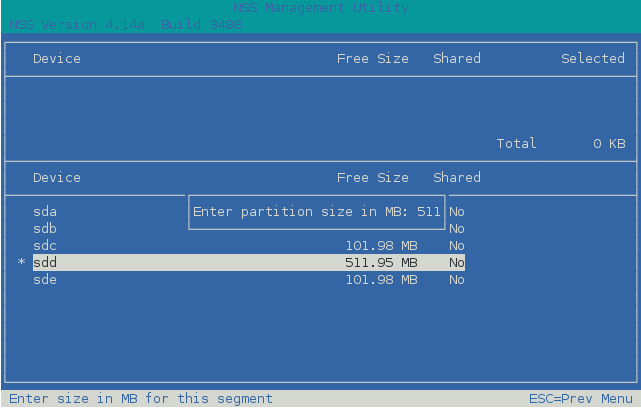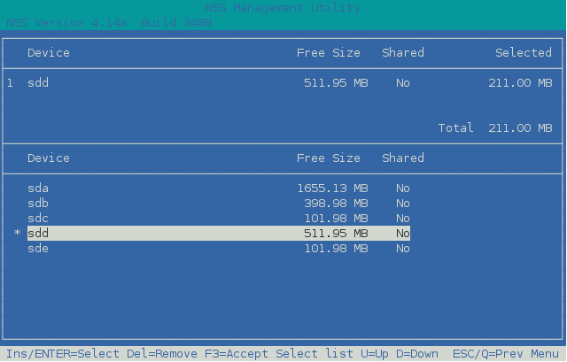 Use the Up-arrow and Down-arrow keys to highlight a device from the list, then press Insert or Enter to select the device. IMPORTANT:NSSMU does not support using Linux software RAID devices and NSS software RAID devices with Linux POSIX file systems. You can use a hardware RAID device to achieve device fault tolerance for Linux POSIX volumes.