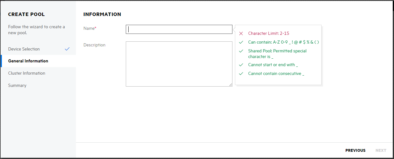 On the INFORMATION page, specify a name for the new pool, then click NEXT.