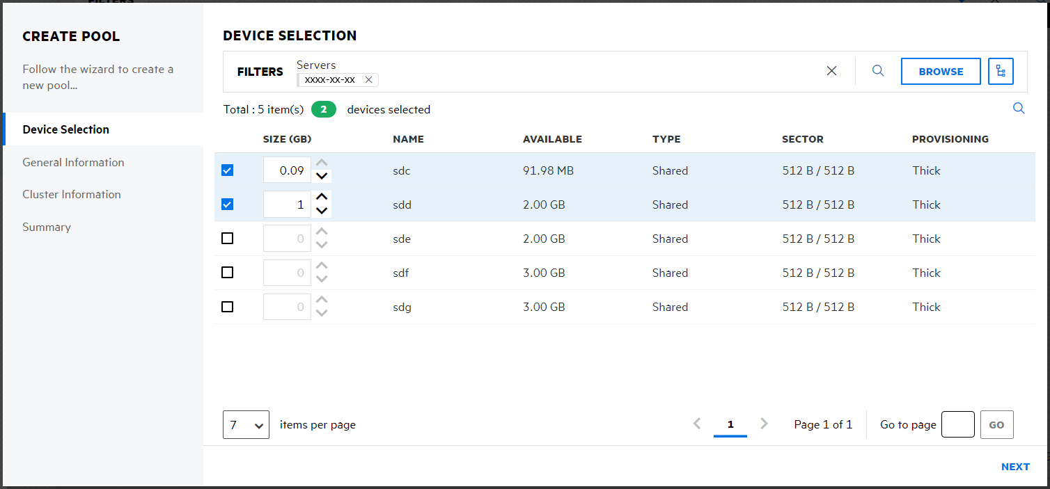 Specify the device space up to the free space available on the devices for the pool, and then click NEXT.