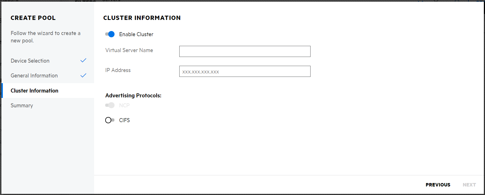 If the selected device type is shared, on the CLUSTER INFORMATION page, specify the details as required, and then click NEXT.