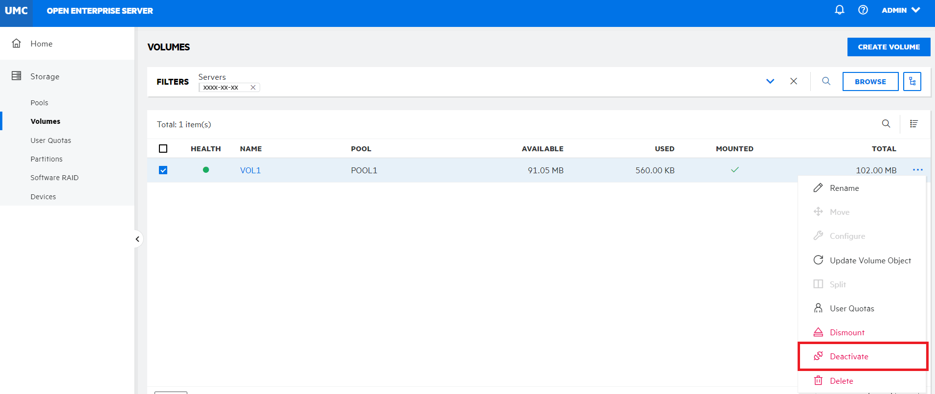 1. Select the volume, click More Options icon, and then select Deactivate.