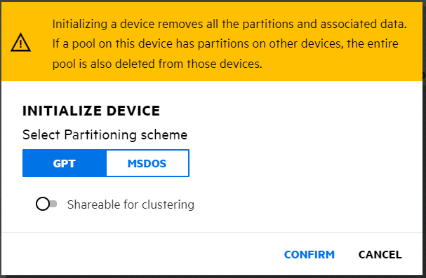 4. Select the partitioning scheme, click Sharable for clustering option for device sharing if required, and then click CONFIRM.