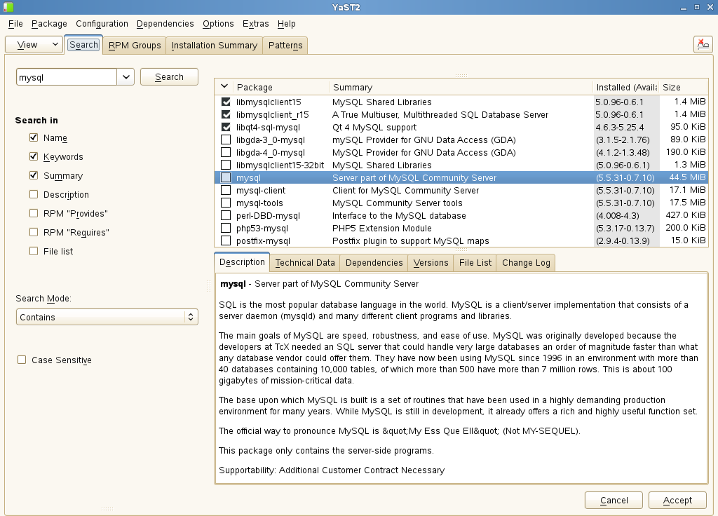 Before you configure MySQL with Novell Cluster Services, MySQL must be installed and configured properly on all servers in the cluster where you intend to run it. You can use the YaST Software Management tool to install the MySQL and the MySQL Client packages. Other MysQL packages are available that allow you to use MySQL with Perl, PHP, Postfix, or Python, but this guide does not cover their installation or use.