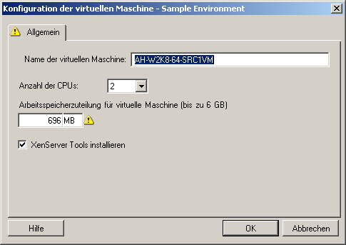 Weitere Informationen zu hostspezifischen Konfigurationsoptionen für die Ziel-VM im Dialogfeld „Konfiguration der virtuellen Maschine“ finden Sie unter Ziel-VM-Konfiguration: Citrix XenServer.