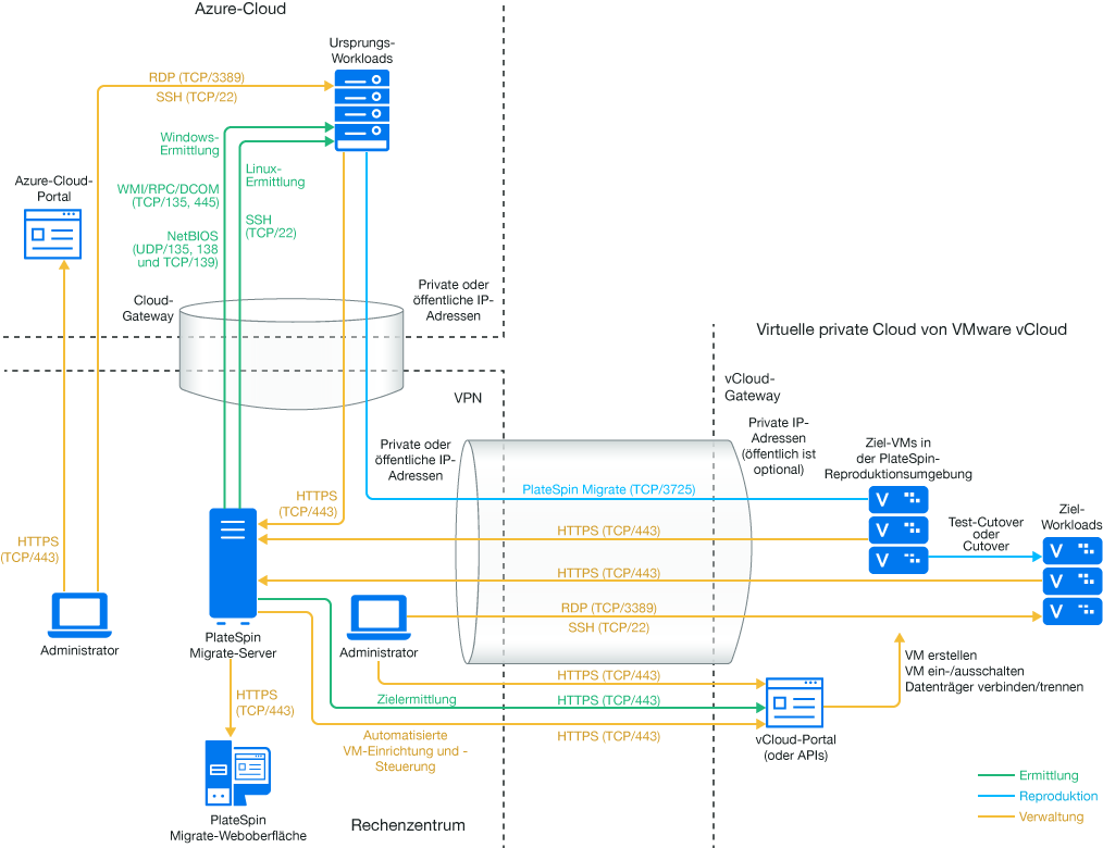Migrate Agent ist nicht erforderlich, weil ein VPN verfügbar ist, kann aber dennoch verwendet werden. Informationen zu den Anforderungen an Netzwerkports und Firewalls für die Registrierung finden Sie unter Abschnitt 2.6.2, Voraussetzungen für die Workload-Registrierung.