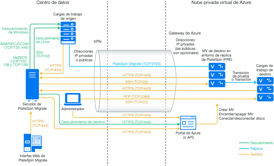 NOTA:la Figura 9-1 muestra el descubrimiento automatizado y los requisitos de red de las cargas de trabajo Windows y Linux. Opcionalmente, puede usar el agente de Migrate en la carga de trabajo de origen para registrar la carga de trabajo y enviar sus datos de inventario al servidor de PlateSpin Migrate mediante HTTPS (TCP/443). Consulte Sección 2.6.2, Requisitos para el registro de la carga de trabajo y Sección 22.7, Registro de cargas de trabajo y descubrimiento de detalles con el agente de Mígrate.