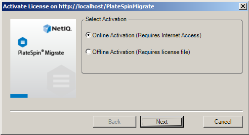 Cuando se lanza el cliente de PlateSpin Migrate por primera vez después de la instalación, se abre el asistente de activación de licencias y se le pide que active su licencia del producto.