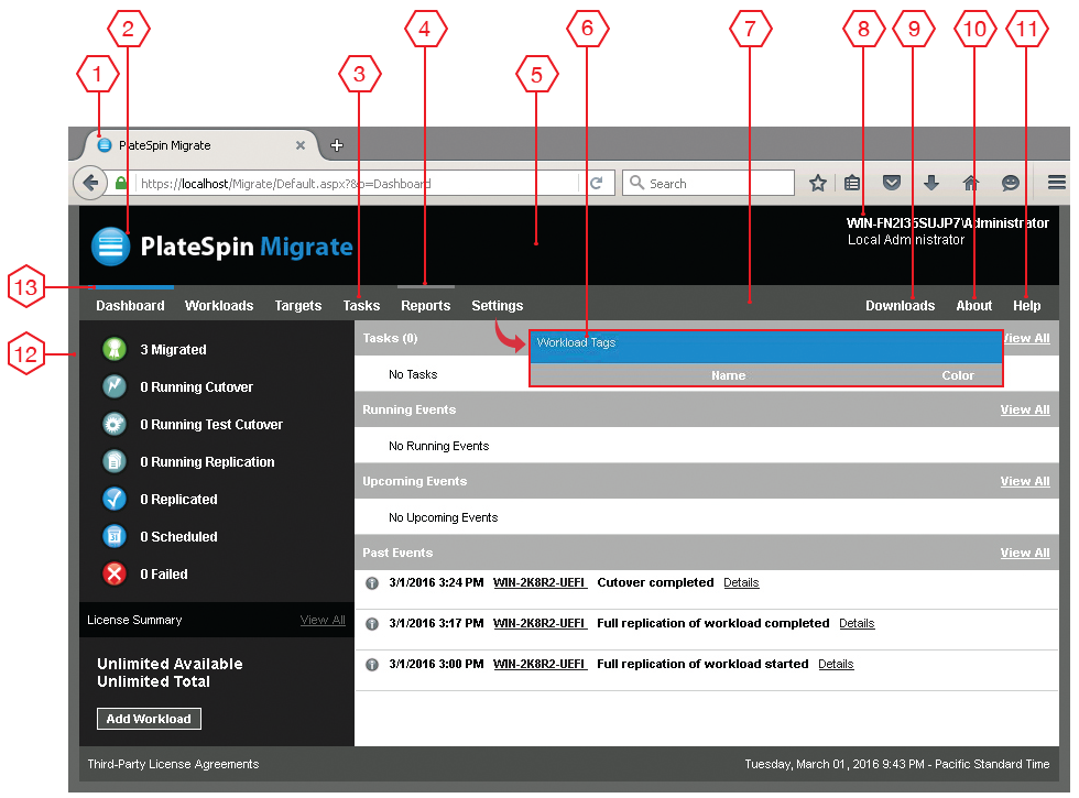 El aspecto de la interfaz Web de PlateSpin Migrate es coherente entre las distintas páginas. En la Figura B-1 de la consola de PlateSpin Migrate se identifican los elementos que se pueden modificar en la interfaz de usuario de la interfaz Web con indicadores numéricos. Para obtener información sobre el parámetro relacionado con cada elemento, consulte la Sección B.1.2, Modificación de los valores de configuración de PlateSpin para los elementos configurables de la interfaz de usuario.