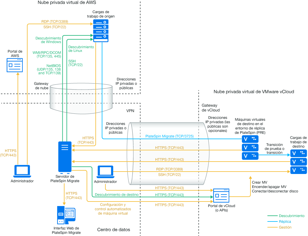• El agente de Migrate no es necesario porque hay disponible una VPN, pero funcionaría también. Para los puertos de red y los requisitos del cortafuegos para el registro, consulte la Sección 2.6.2, Requisitos para el registro de la carga de trabajo.