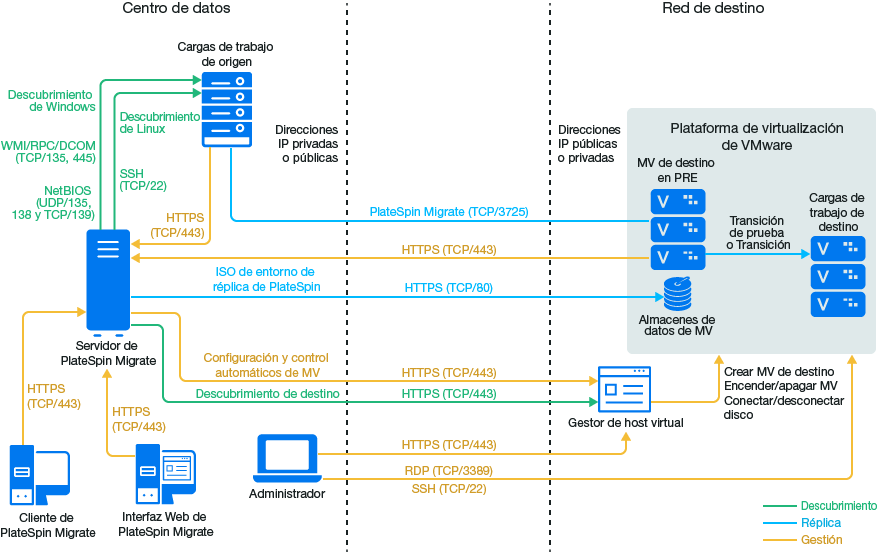 NOTA:la Figura 13-1 y la Figura 13-2 muestran los requisitos para el descubrimiento automatizado y la red para las cargas de trabajo Windows y Linux. Opcionalmente, puede usar el agente de Migrate en la carga de trabajo de origen para registrar la carga de trabajo y enviar sus datos de inventario al servidor de PlateSpin Migrate mediante HTTPS (TCP/443). Consulte Sección 2.6.2, Requisitos para el registro de la carga de trabajo y Sección 22.7, Registro de cargas de trabajo y descubrimiento de detalles con el agente de Mígrate.