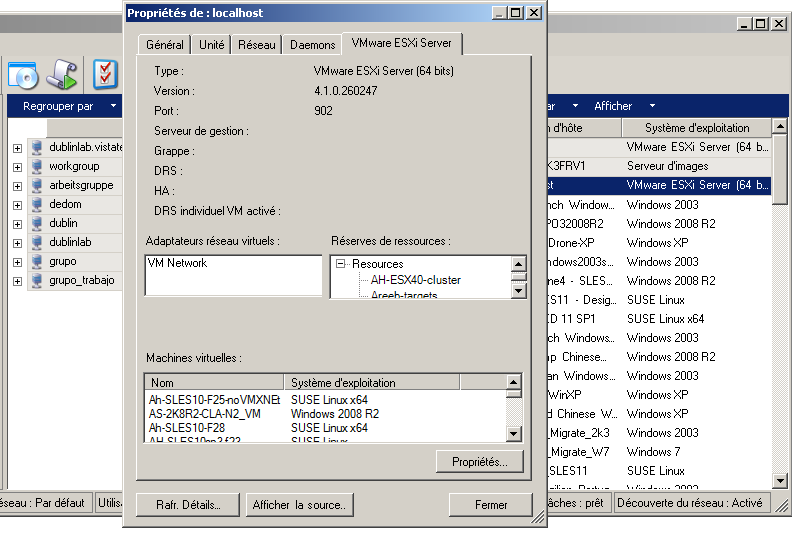 La figure suivante affiche les propriétés d'un serveur VMware ESX découvert.