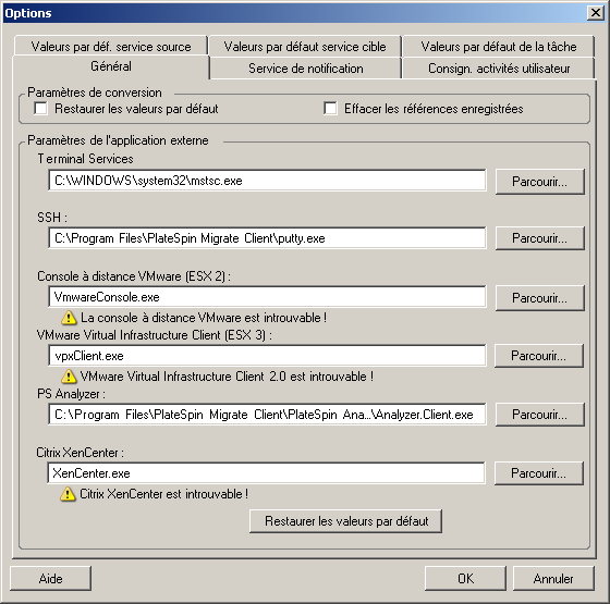 Le client PlateSpin Migrate vous permet de restaurer les paramètres par défaut, d'effacer les informations d'identification enregistrées et de spécifier les emplacements des fichiers exécutables des applications externes que vous pouvez lancer à partir du client.