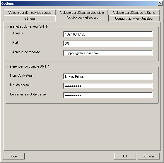 Le client PlateSpin Migrate vous permet de spécifier les paramètres du serveur SMTP pour les notifications de progression des événements et des tâches.