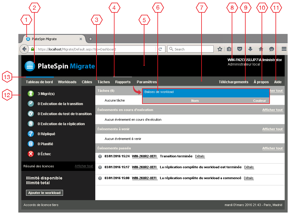 L'apparence de l'interface Web de PlateSpin Migrate est cohérente sur toutes les pages. La représentation du tableau de bord de PlateSpin Migrate dans la Figure B-1 identifie les éléments que vous pouvez modifier dans l'interface utilisateur de l'interface Web au moyen d'une légende numérotée. Pour plus d'informations sur le paramètre associé à chaque élément, reportez-vous à la section Section B.1.2, Modification des paramètres de configuration de PlateSpin pour les éléments configurables de l'interface utilisateur.