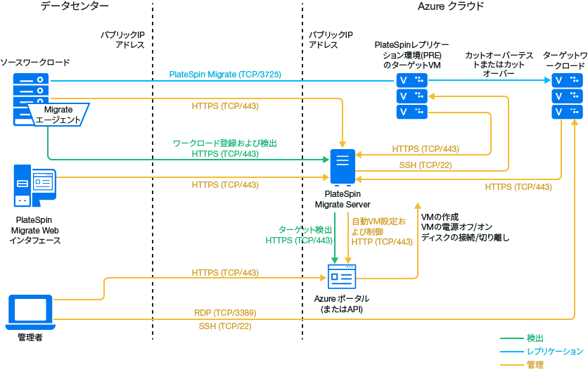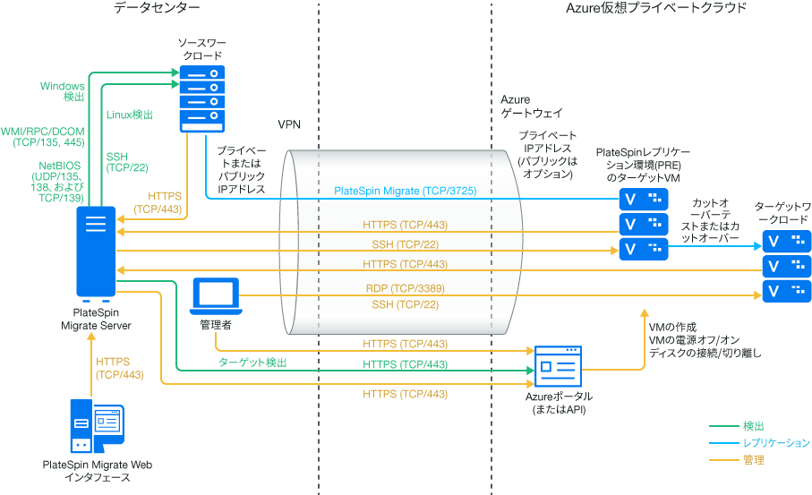 メモ:図 9-1は、自動検出およびWindowsワークロードとLinuxワークロードのネットワーク要件を示しています。別の方法として、ソースワークロード上でMigrate Agentを使用してワークロードを登録し、そのインベントリ詳細をHTTPS (TCP/443)経由でPlateSpin Migrateサーバに送信することができます。セクション 2.6.2, ワークロード登録の要件およびセクション 22.7, Migrate Agentによるワークロードの登録と詳細の検出を参照してください。