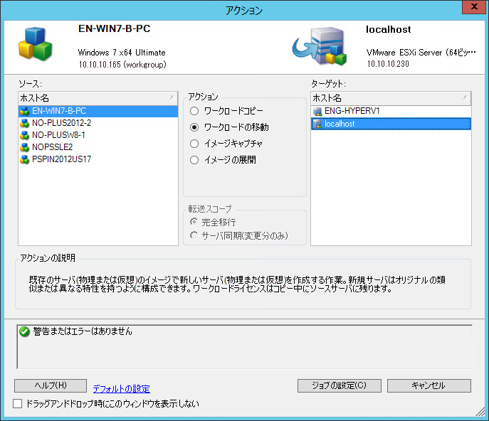 [ソース]および[ターゲット]ペインには、選択されたマイグレーションジョブの種類に当てはまるワークロードおよびターゲットが表示されます。
