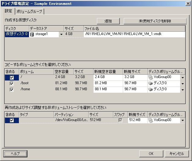 マイグレートするドライブとボリュームの環境設定を指定します。