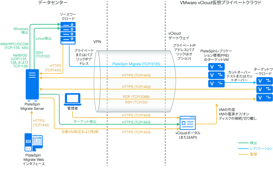 メモ:図 10-1は、自動検出およびWindowsワークロードとLinuxワークロードのネットワーク要件を示しています。別の方法として、ソースワークロード上でMigrate Agentを使用してワークロードを登録し、そのインベントリ詳細をHTTPS (TCP/443)経由でPlateSpin Migrateサーバに送信することができます。セクション 2.6.2, ワークロード登録の要件およびセクション 22.7, Migrate Agentによるワークロードの登録と詳細の検出を参照してください。
